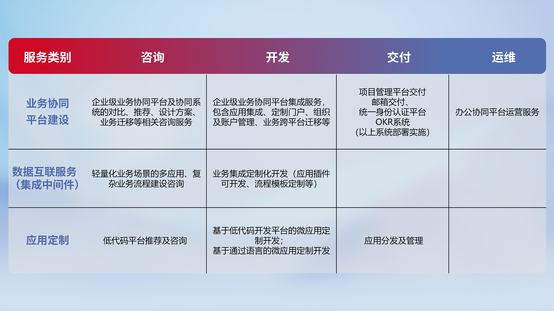 针对钉钉、、企微、、IDaas等平台级产品提供产品的规划、、、方案、、交付、、、定制化开发等服务,,实现如统一协同办公、、、智能客户服务、、混合会议管理、、智能数据查询、、等业务场景,,,实现数字化转型。。