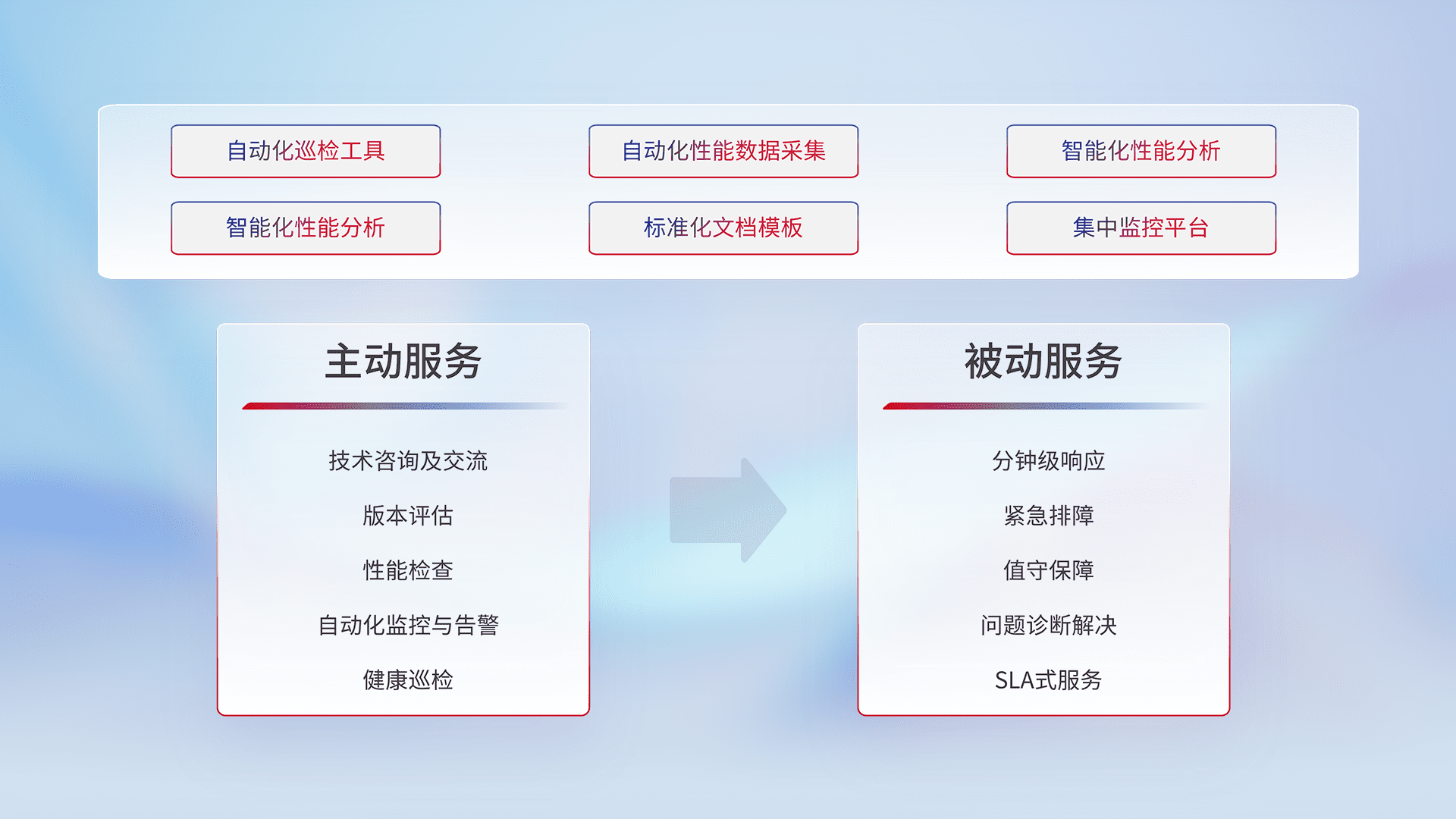 智能化工具和标准化文档,,保障服务质量,,,,提供主动服务(包含技术咨询、、、版本评估、、性能检查、、、自动化监控与告警、、、、健康巡检)和被动服务包含(分钟级响应、、紧急排障、、值守保障、、问题诊断解决、、、、SLA服务)。。。
